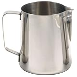18/10 gauge high quality stainless steel. 32 ounce straight side steaming pitcher. This is the most popular style of espresso milk steaming pitcher available anywhere and is the very same frothing pitcher many barista and espresso pros use to create contest winning latte art. Dimensions 3 5/8" x 5" tall
