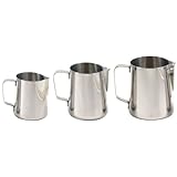 Rattleware latte art pitchers are made from heavy duty stainless steel. This popular style of steaming pitcher features a tapered body and a pronounced spout making these pitchers ideal for perfoming latte art. This set includes three sizes of pitchers for all of your needs a 12-ounce macchiato pitcher, a 20-ounce cappuccino pitcher and a 32-ounce latte pitcher.